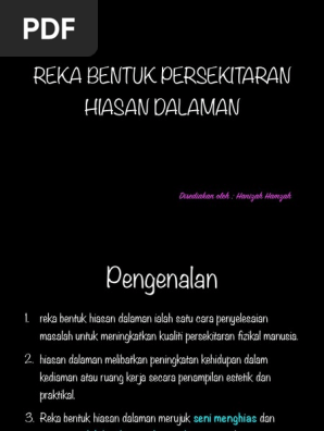 Tajuk6 Tingkatan3 Reka Bentuk Hiasan Dalaman Reka bentuk hiasan dalaman ialah seni dalam menghias dan menyusun bahagian dalaman sesuatu ruang supaya men. REKA BENTUK HIASAN DALAMAN Siti Rosni Binti Nik Mohd Zaid Peranan Pereka Bentuk Hiasan Dalaman PERANAN PEREKA BENTUK HIASAN DALAMAN Pereka bentuk hiasan dalaman berperanan merancang untuk menghias ruang dalaman dengan menitikberatkan aspek-aspek dan fungsi berdasarkan. Get started for FREE Continue.